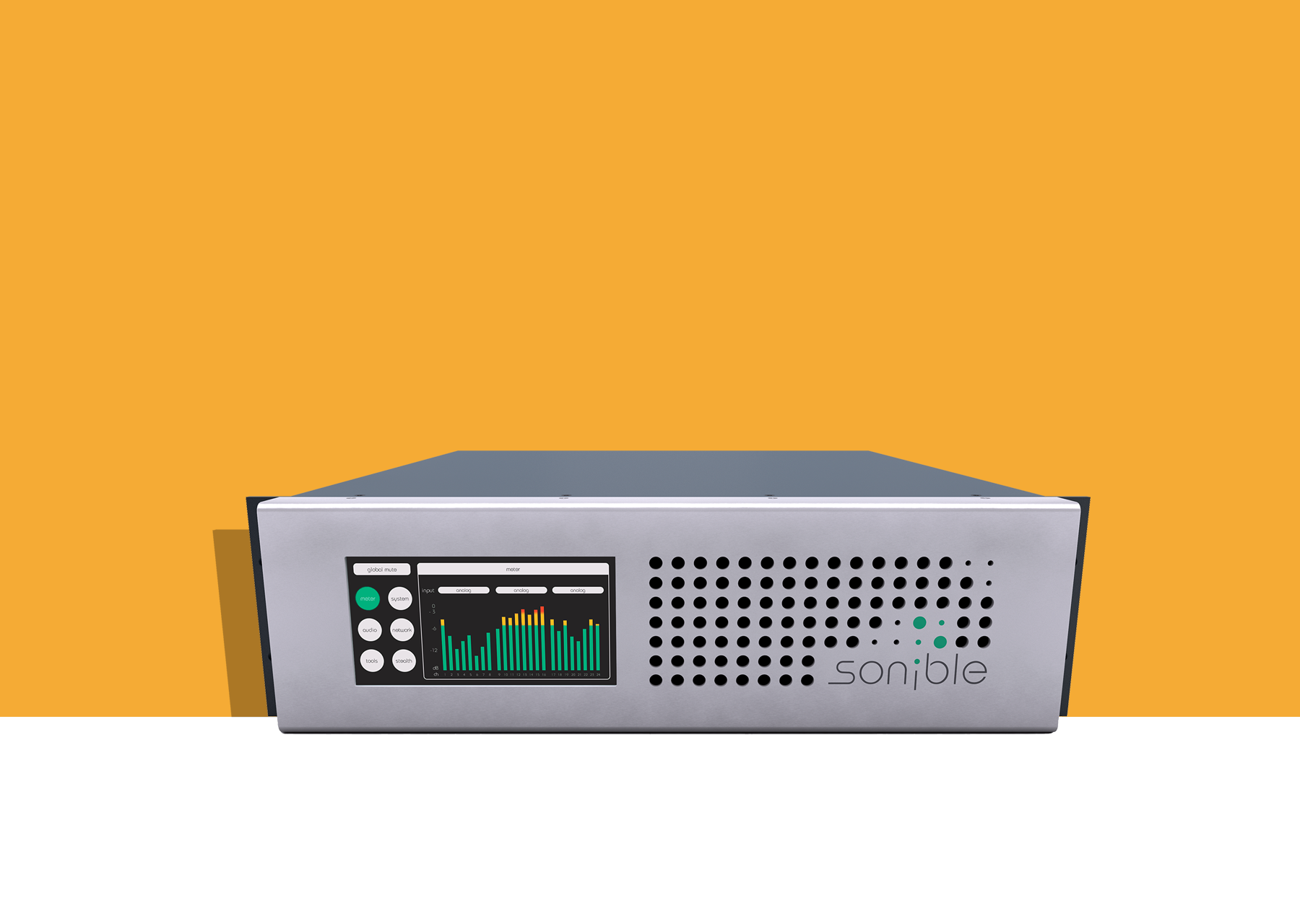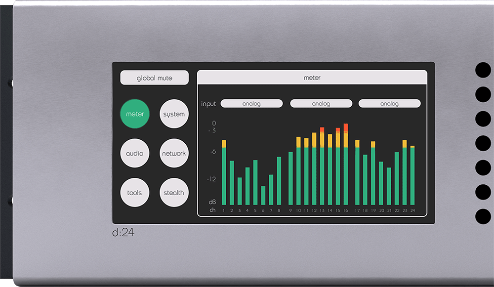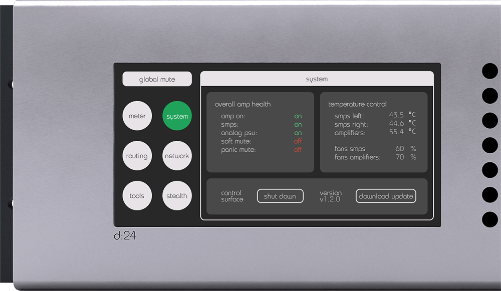 d:24 by sonible GmbH is a 24-channel amplifier which can be controlled by a touch interface on the amplifier or a remote web interface.