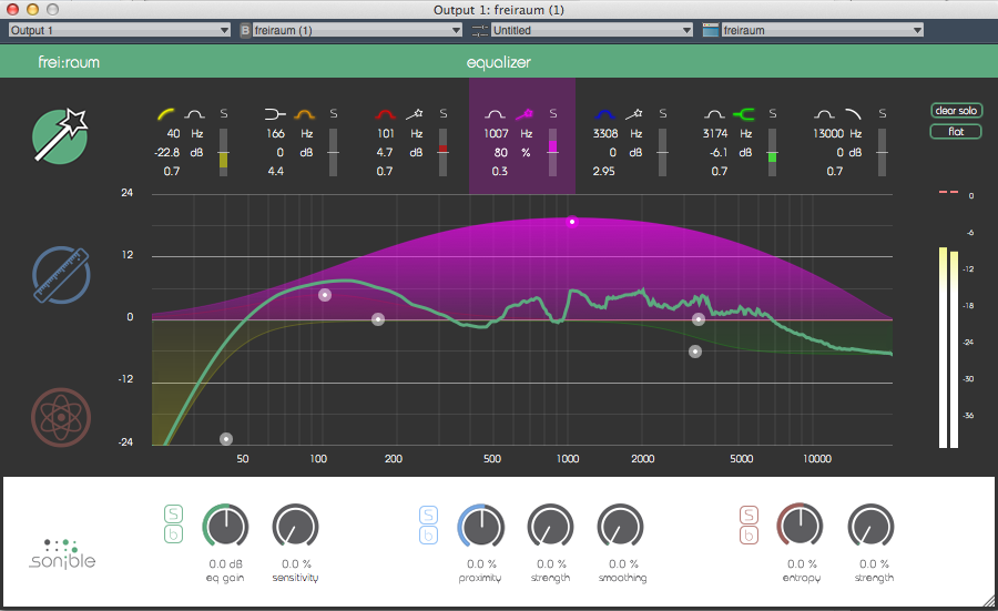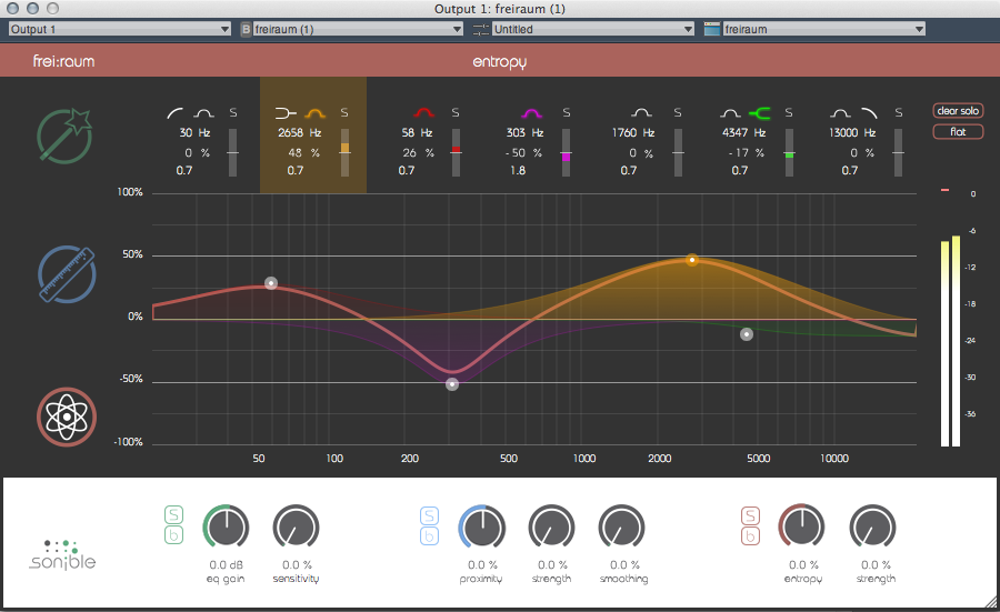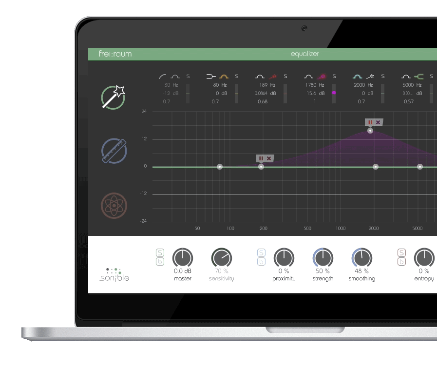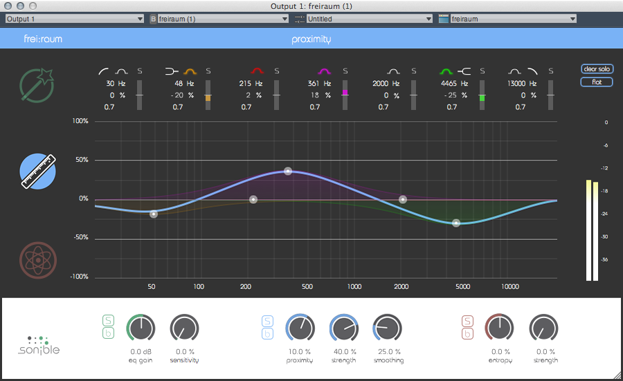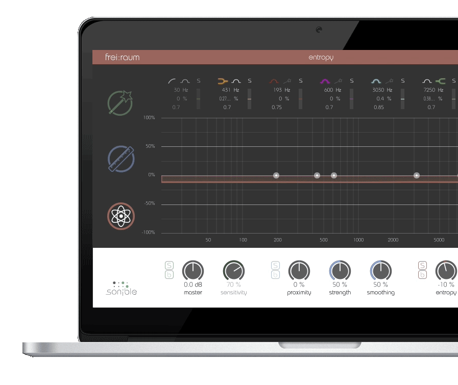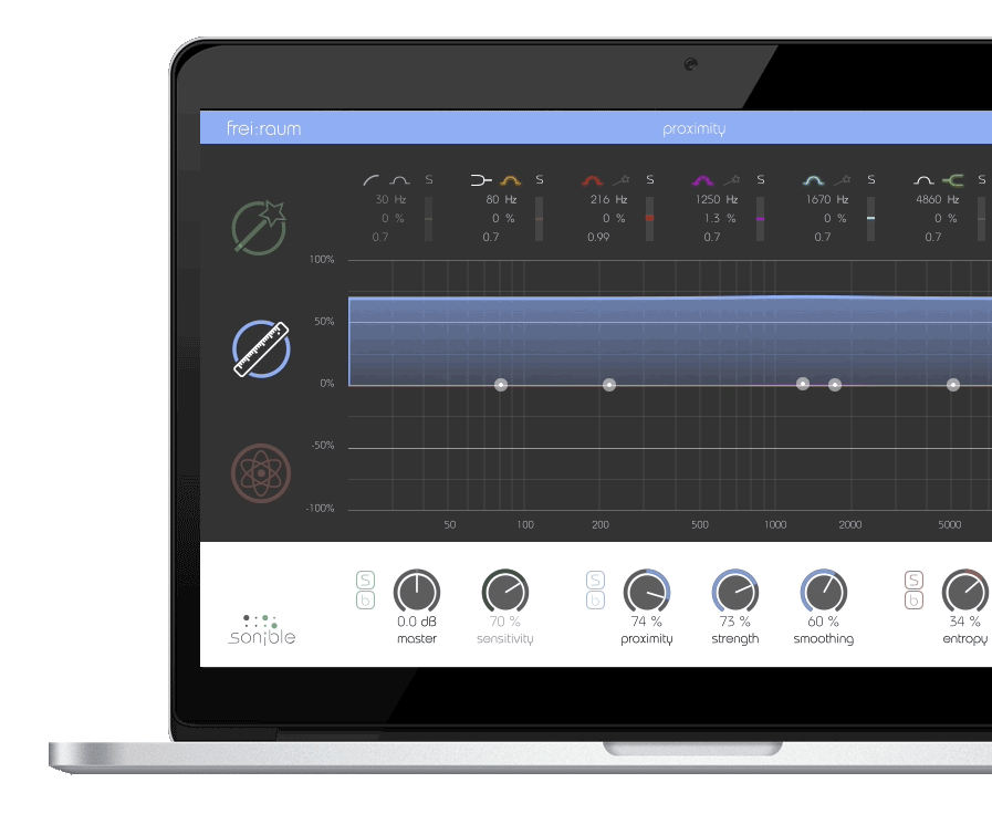 frei:raum by sonible GmbH is an audio plug-in with three interacton layers for different audio processing tasks. The first layer, called 'smart:eq', provides manual and automatic adjustment of the spectral balance of a track. The second layer 'proximity:eq' enables simple and fast adaption of the spaciousness of a recording within different frequency ranges. Thirdly, the 'entropy:eq' adjusts the tonal and inharmonic components of a sound.